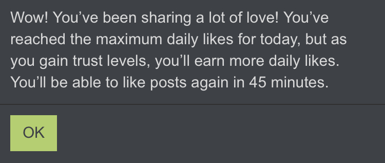 I was able to like again 5 minutes ago, liked 3 posts and hit the limit again!!