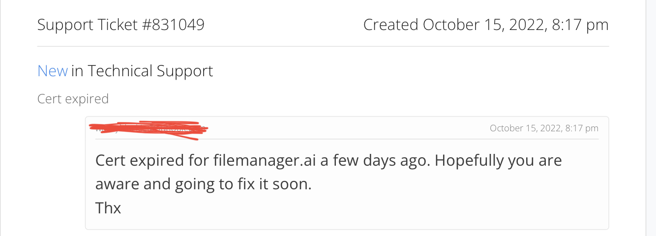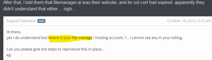 After that, I told them that filemanager.ai was their website, and its ssl cert had expired. apparently they didn’t understand that either… sigh…