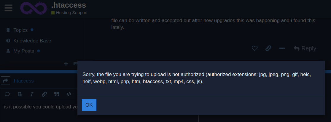 I just tried uploading .htaccess to a post and got this