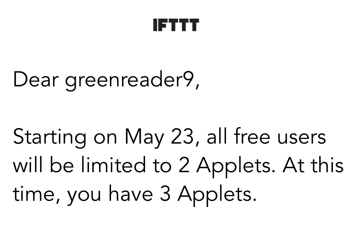 IFTTT is silly. They keep changing the amount of applets on free plan all the time. From 3 to 5 to 1 to 5 to 2 to 5 to 2. It sounds like a trick to make you buy their paid plans. Use Huginn instead