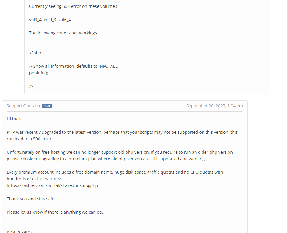 If the Error 500 you see on the volumes you mentioned comes only because of phpinfo(), it is unfortunately expected; volumes on PHP 8.2 experience this issue, because it seems the phpinfo() function doesnât exist. I hope iFastNet can resolve this.