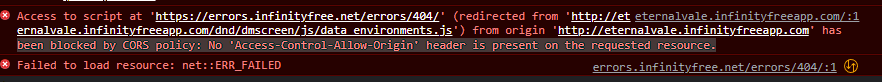The error that you’re facing is that http://eternalvale.infinityfreeapp.com/dnd/dmscreen/js/data_environments.js does not exist.