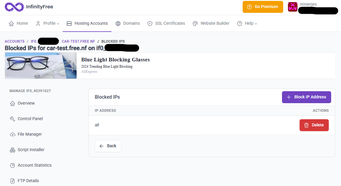 I’ve been building an academic car rental website with laravel (https://car-test.free.nf) but at some point I could no longer access it from any other device or location, there’s always a timeout error. In the account management interface I checked the IP blocking section out of curiosity, and there’s a rule I can’t delete that is blocking all IPs trying to access the website. However, the website is accessible from the devices I originally used for development and testing before the rule appeared; all others can’t access it due to a timeout error.