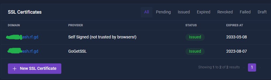 When I tried to make a self-signed SSL Certificate for my website, it was working. The problem is that I paid a new SSL Certificate and I want to use it on my website now. But, I can’t delete the self-signed certificate through the SSL/TLS Configure. I have a free account on Infinityfree. Can someone tell me if it’s impossible to delete this self-signed certificate ?