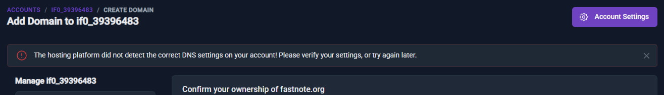 If you want to host your own domain name with InfinityFree, the default way to verify your domain is to set the nameservers first. However, there are cases where setting the nameservers ahead of time is not desirable (for example if you have an existing site which cannot go down) or if your domain provider does not let you set our nameservers.