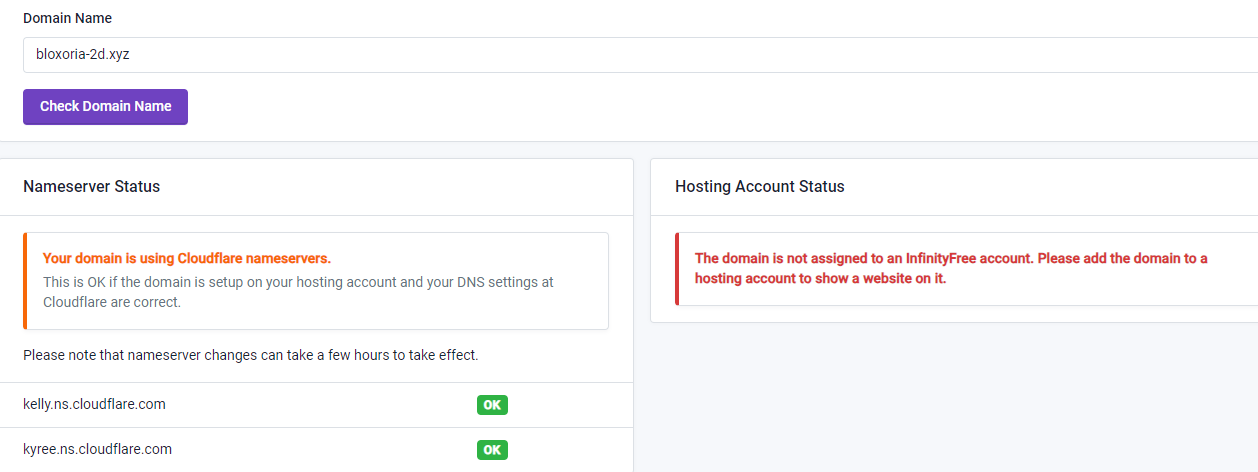 You have to first add the domain to the hosting account (by pointing it to InfinityFree’s nameservers), then you can change them to Cloudflare’s ones and setup Cloudflare for your domain: