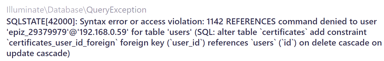 SQLSTATE[42000]: Syntax error or access violation: 1142 REFERENCES command denied to user 'epiz_29379979'@'HIDDEN_IP_ADDRESS' for table 'users' (SQL: alter table `certificates` add constraint `certificates_user_id_foreign` foreign key (`user_id`) references `users` (`id`) on delete cascade on update cascade)