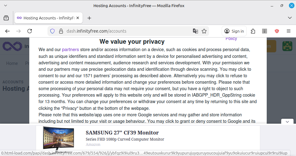 So funny. My laptop didnt let me see the rest of bottom half “We value your privacy” popup. Thats why i cold not agree whats needed by google. Find it on my desktop pc. Issue remains in laptop, but its not infinityfree issue anymore.