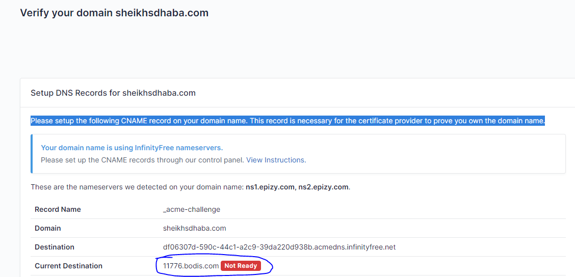 The issue i am facing is that, while i am trying to create Let’s Encrypt SSL, it says to enter the cname according to what it mentioned. I did the same thing in Cpanel, created the cname but it isn’t working. It is keep saying “Please setup the following CNAME record on your domain name. This record is necessary for the certificate provider to prove you own the domain name”. The interesting thing is "It also mentioning the current destination is set to 11776.bodis.com (not ready). Now how to set the ssl please?