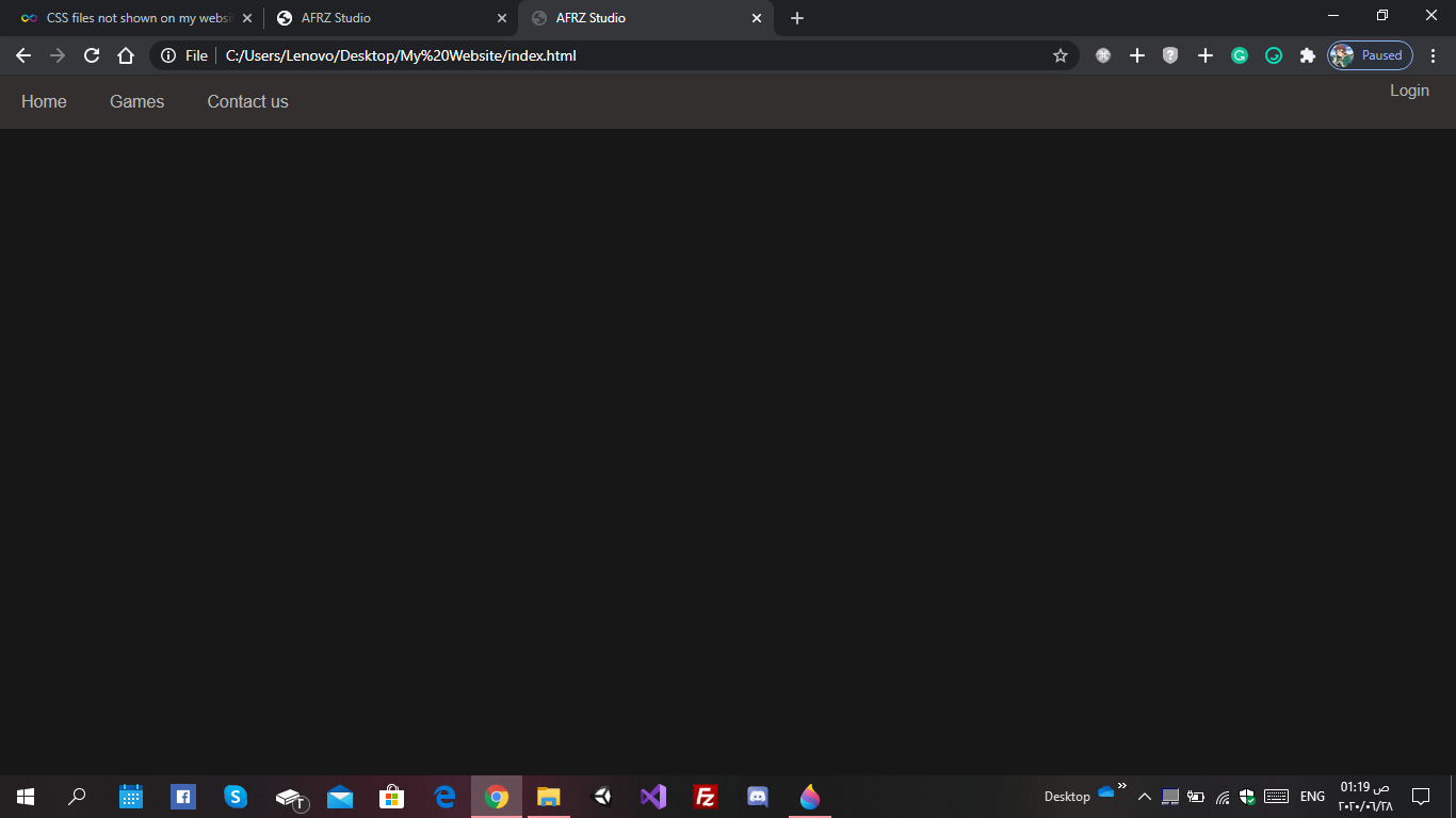 And your CSS file foes not exist to the path you specified in your code, your CSS file should be in “afrzstudio.epizy.com/index.css” base on your code. Make sure to upload your “index.css” file inside the “htdocs” folder and do not put it inside any subdirectories inside the “htdocs” folder or if you want to then you will need to edit your code to have the correct path.