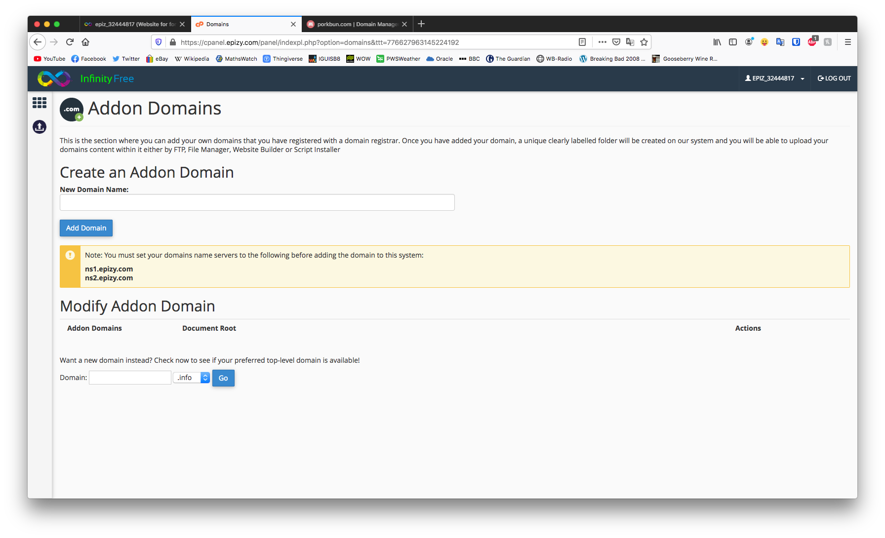 IT IS. What don’t you understand? It needs admin intervention as the main website on infinityfree thinks the domain is still attached whereas the one on cpanel doesnt think its attached. It needs removing by @Admin on the infinityfree site.