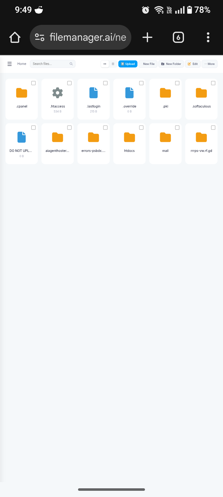 In the InfinityFree File Manager, the domain-specific root directory is not visible. The control panel (account homepage) still shows the domain as active and attached, but the File Manager view does not reflect the domain’s directory (screenshot attached).