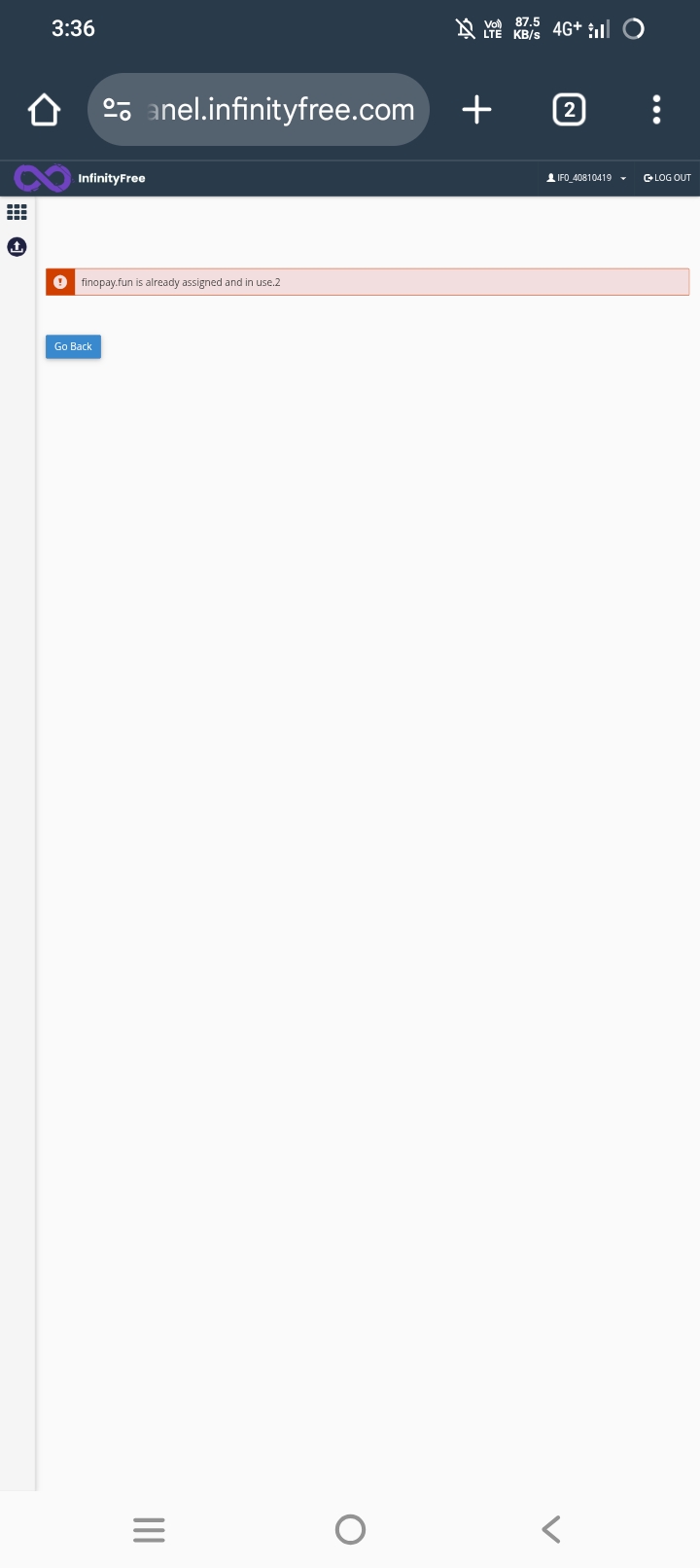 InfinityFree shows that this domain is already assigned to another InfinityFree account, which prevents me from using it on my correct account.