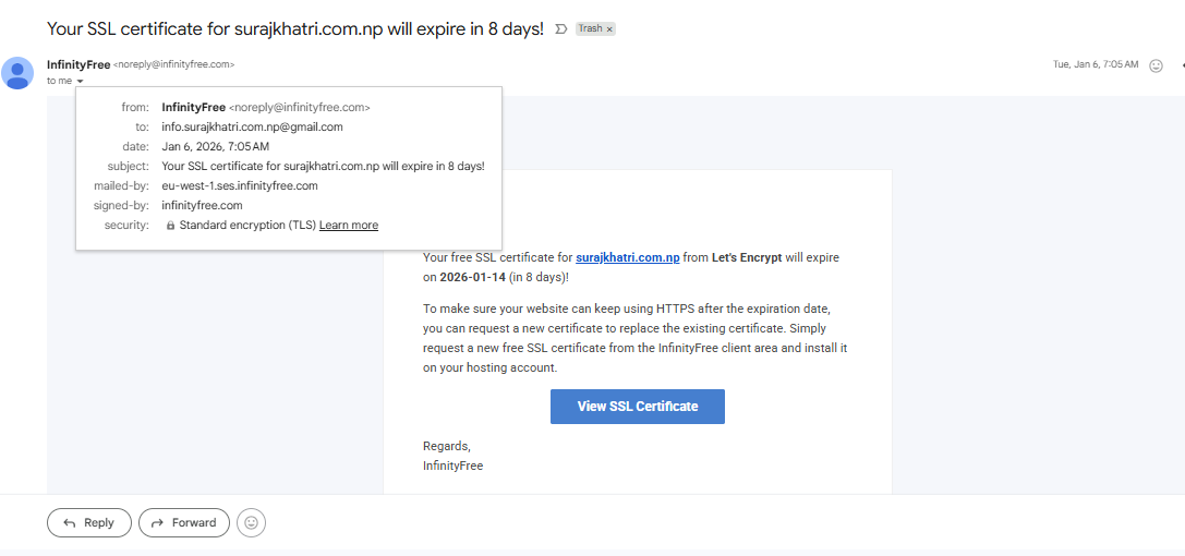 Even though I cannot access the old account, I have already provided proof that these domains belong to me. The WHOIS data clearly shows me as the owner, and this can be verified directly from the official .np registry at https://register.com.np/whois-lookup. I have also shared a screenshot of an SSL certificate issue email, which shows that these domains were previously used on the same InfinityFree account ([email protected]). This confirms that I was the legitimate user of these domains on InfinityFree.