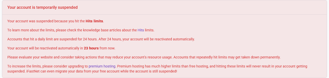 Jri-Creator’s site did find success. But we have no idea how was your site’s design consuming/managing resources. Only indication is the suspension. Then add the bots in the equation. You can try redesigning but note that free hosting sites don’t cater much to resource-intensive apps.