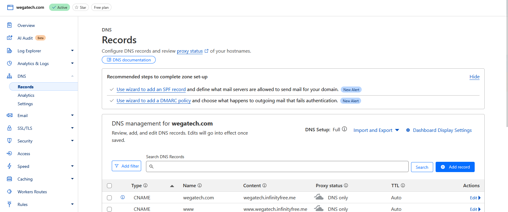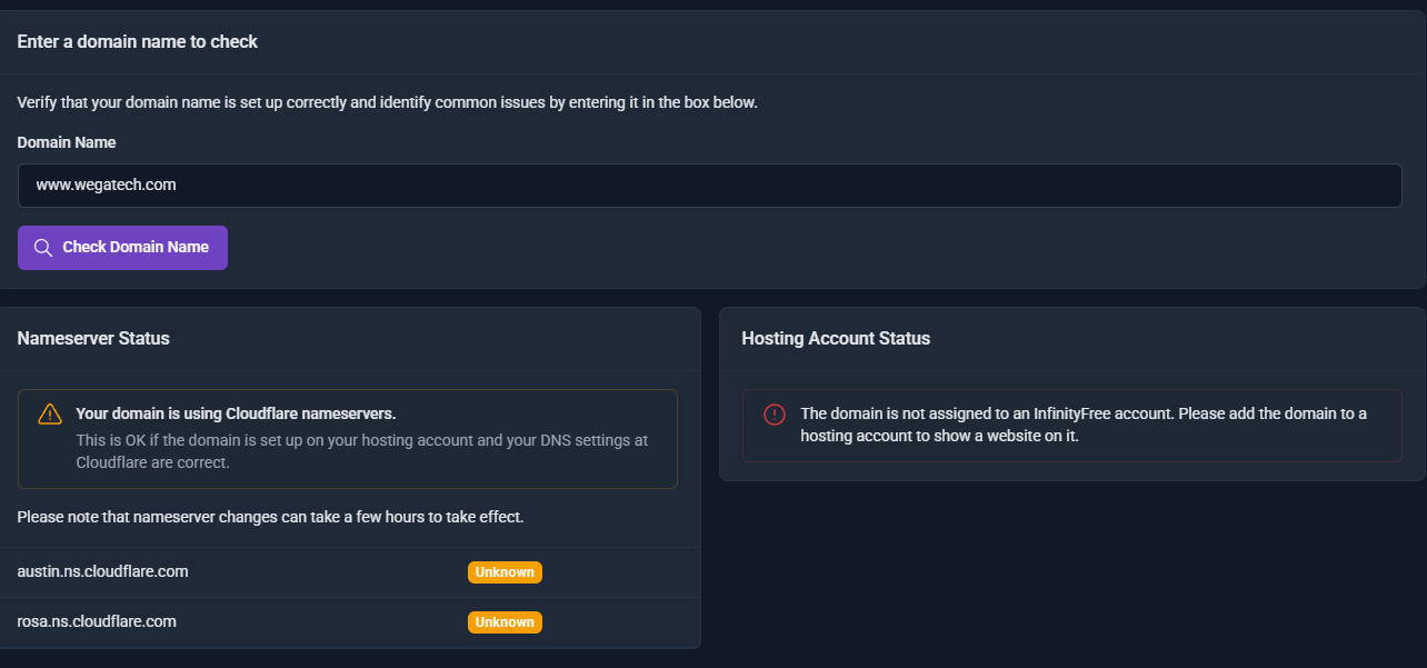 I had configured in Cloudflare with CNAME pointing to wegatech.infinityfree.me