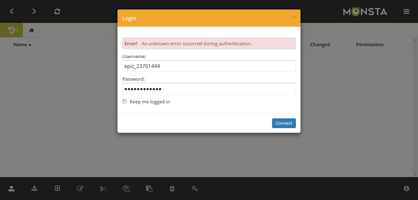 Normally, when I click the ‘Go to File Manager’ button on my account dashboard, it opens Monsta FTP in a new tab and auto-logs-in. But today, if I do that, an authentication dialog appears on the Monsta FTP screen. If I enter the website/FTP username and password given to me during registration, it says ‘An unknown error occurred during authentication’. If I try multiple times, it says ‘Error!’
