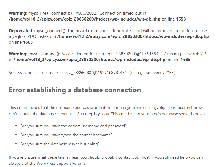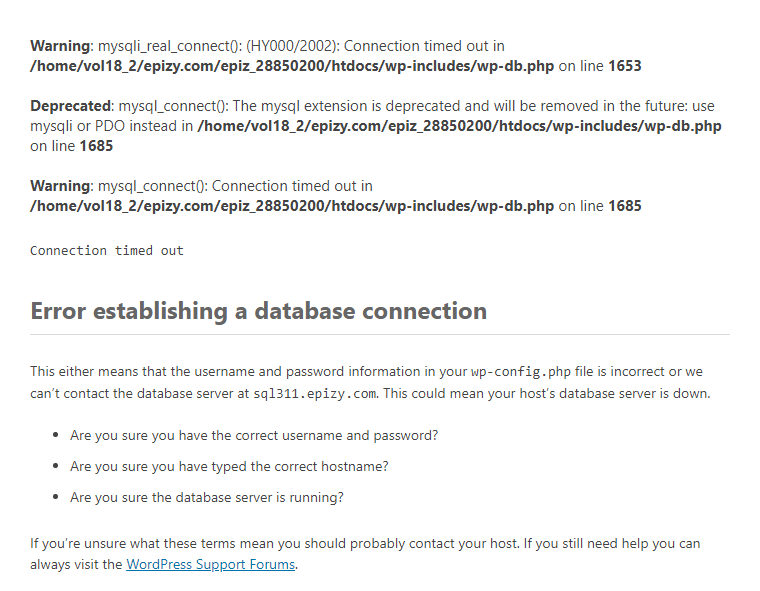 Warning : mysqli_real_connect(): (HY000/2002): Connection timed out in /home/vol18_2/epizy.com/epiz_28850200/htdocs/wp-includes/wp-db.php on line 1653