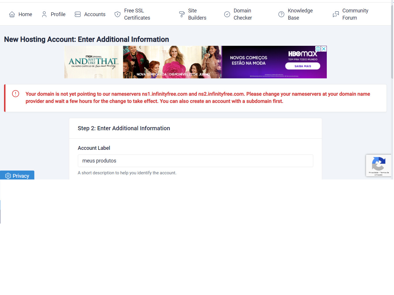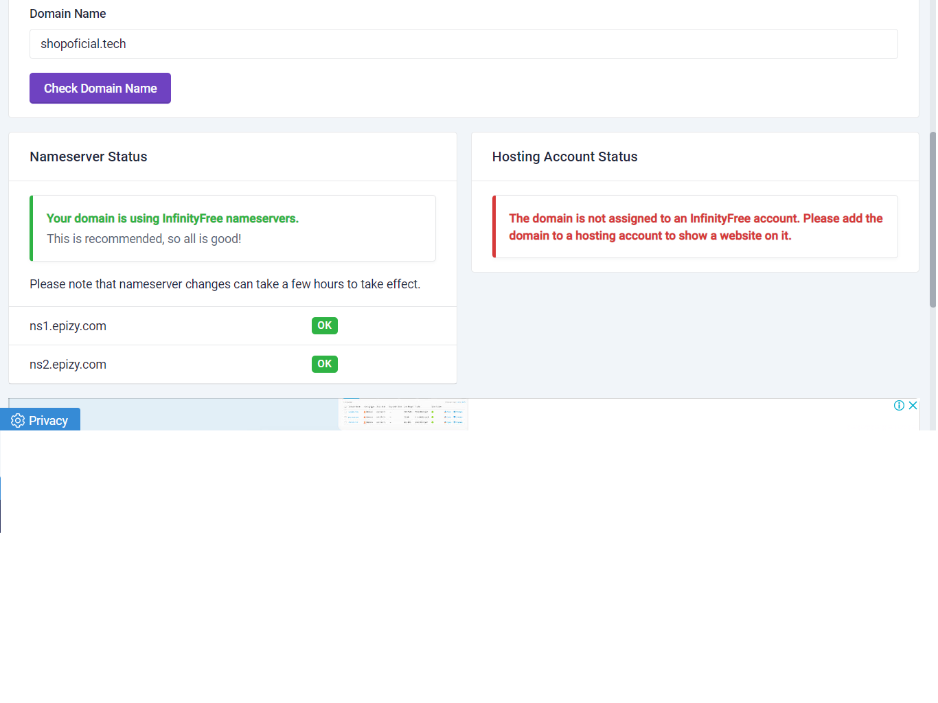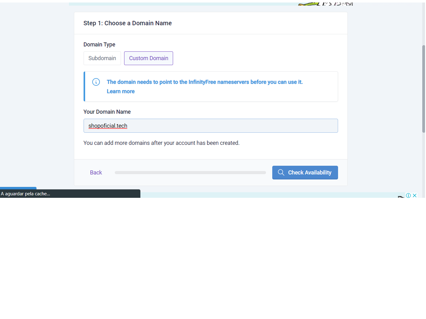 (Your domain is not yet pointing to our nameservers ns1.infinityfree.com and ns2.infinityfree.com. Please change your nameservers at your domain name provider and wait a few hours for the change to take effect. You can also create an account with a subdomain first.)
