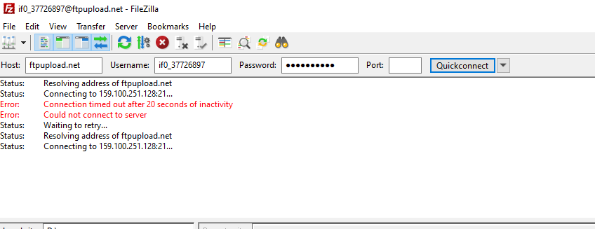 I cannot access the files due to a connection issue. I am logged into the Cpanel, but when I try with Filezilla, nothing works. Here is the screenshot