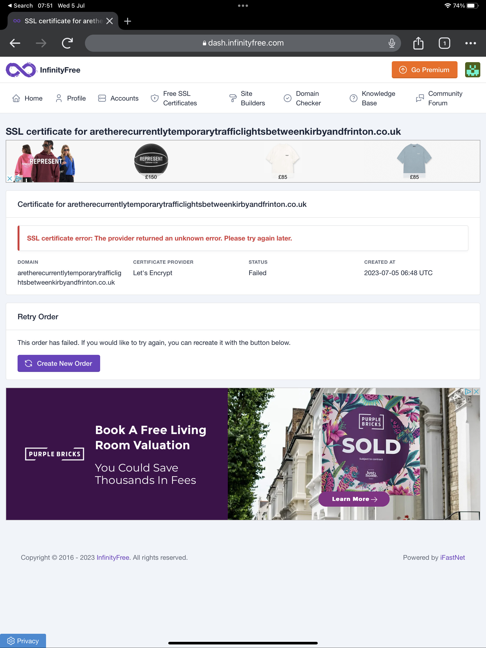 I’ve got my own domain which is all setup and working. I’ve added the CNAME info to the zone file, but when I try to generate a free SSL cert, it fails for an unspecified reason.