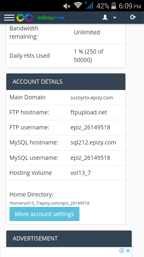 What does your Main Domain say, this way i can see if your accountâs IP is being transferred, it should be if the format of xxxxxxxx.epizy.com. @anon82919479