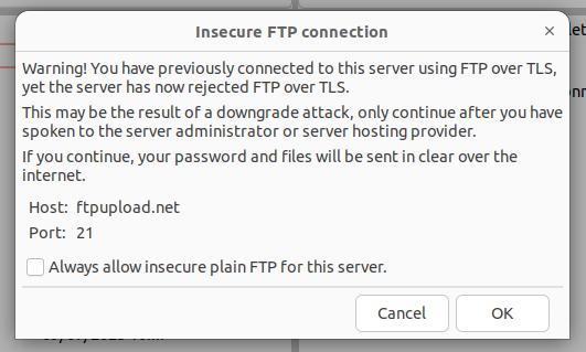 I have recently changed ISPs and am wondering whether they might be blocking somehow. I note this thread where the “Status: Insecure server, it does not support FTP over TLS.” message is visible in attempts to access the ISP’s own FTP site. (ISP name is TPG)