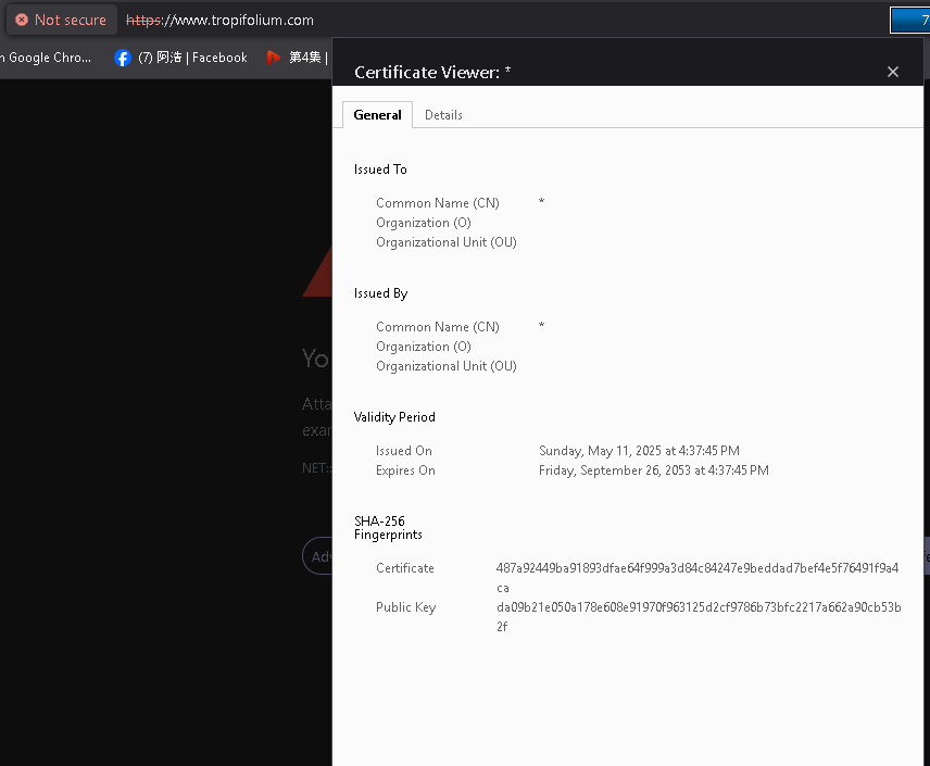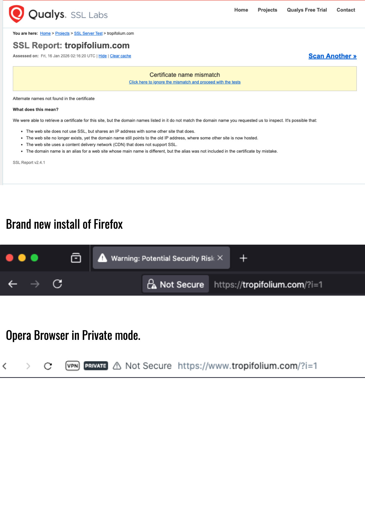 What this basically means is: yes, while your server has an SSL certificate installed, that certificate is not valid for your domain (tropifolium www.tropifolium). Browsers will always reject it because of this fact.