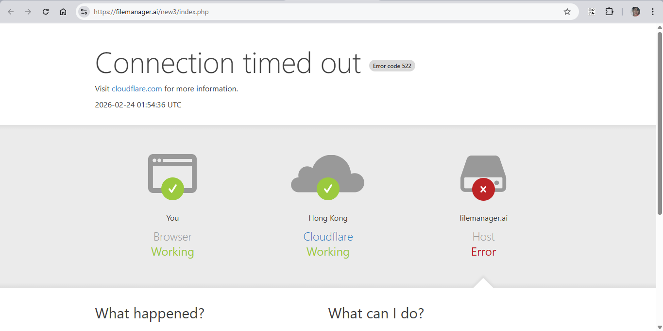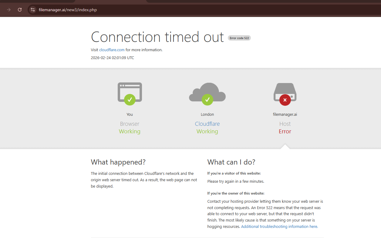 It appears that there was a short outage in the hosting platform resulting in various services being unavailable, including the file manager. This was fixed shortly after.