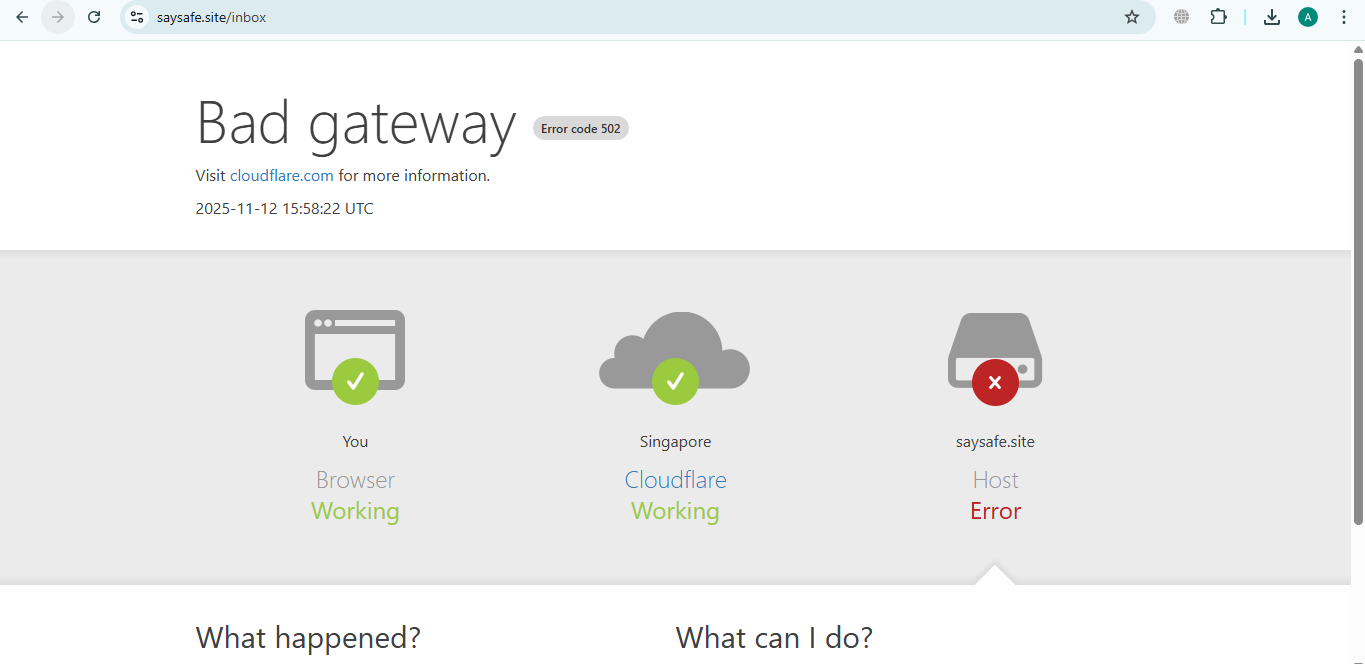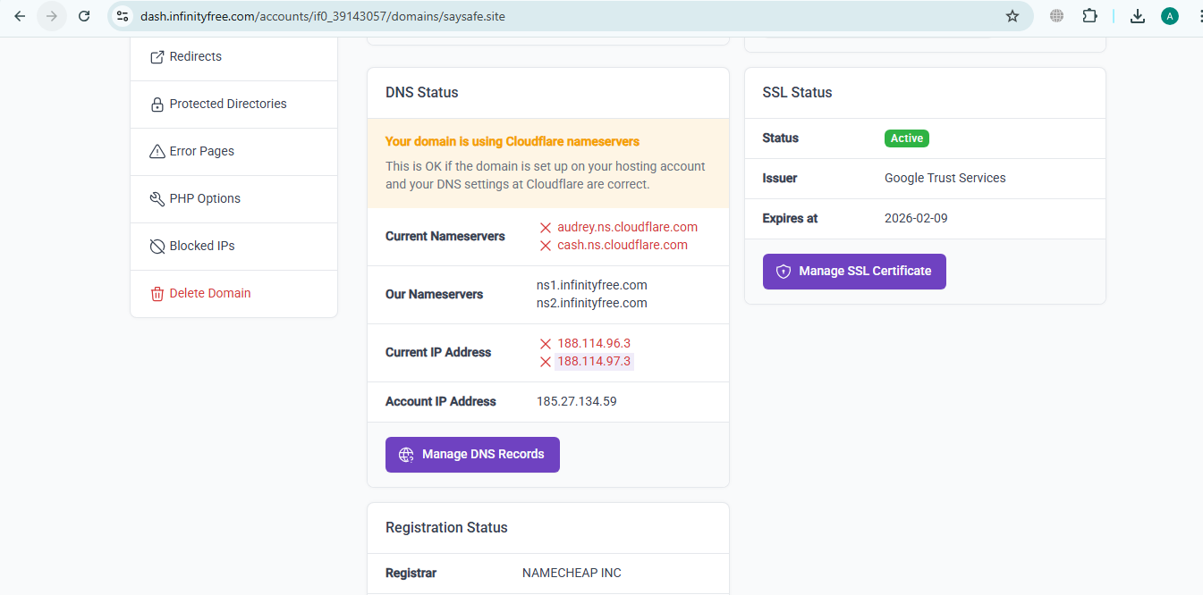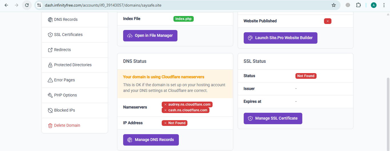 domain is saysafe.site when we connected domain to cloudflare then showing hosting ip adress not found