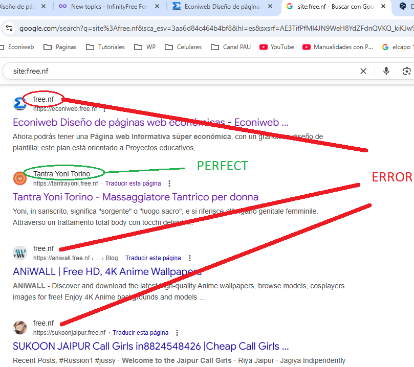 Google search results show the term “free.nf” instead of my page name. I’ve tried to fix this in the WordPress settings, the hosting settings, the Divi template generator plugin settings, YOAST SEO, Google Search Console, and nothing. I can’t figure out how to fix it.