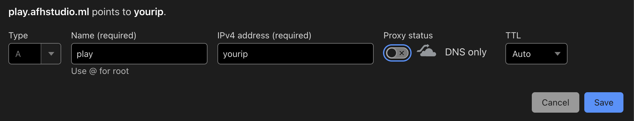 Click “Add Record” and make an A record pointing to your server IP. If your IP is a domain, make it a CNAME Record. Make sure the record is set to DNS Only.