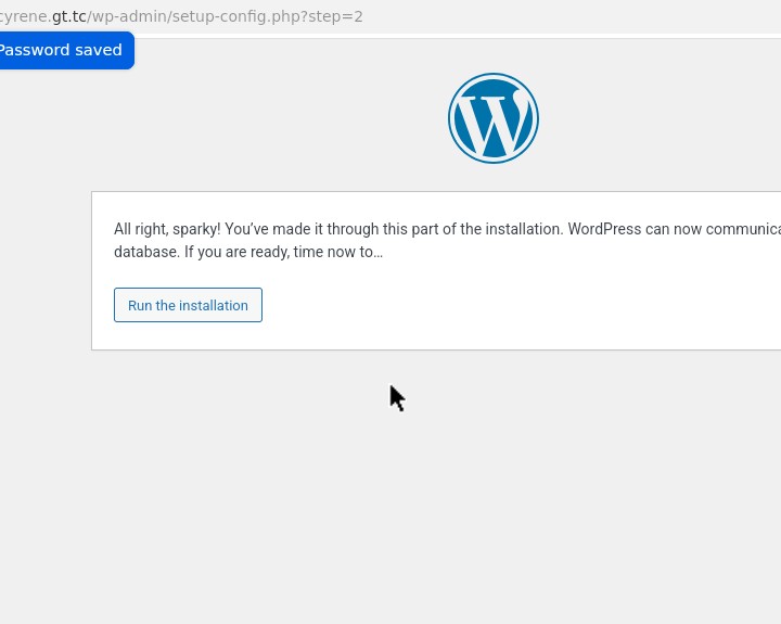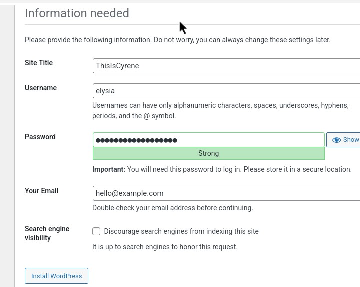 Provide the required information (and make sure to save/copy the auto-generated password), and click Install WordPress.