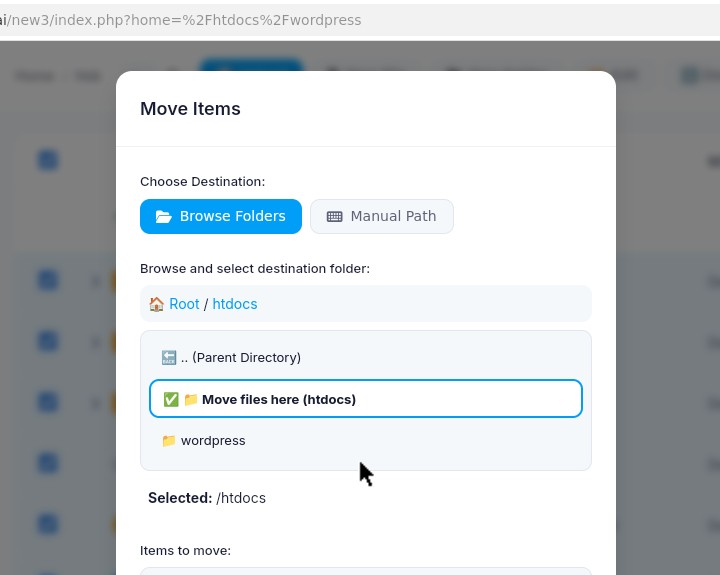Root/htdocsorRoot/example.com/htdocs, scroll down, and click Move. -