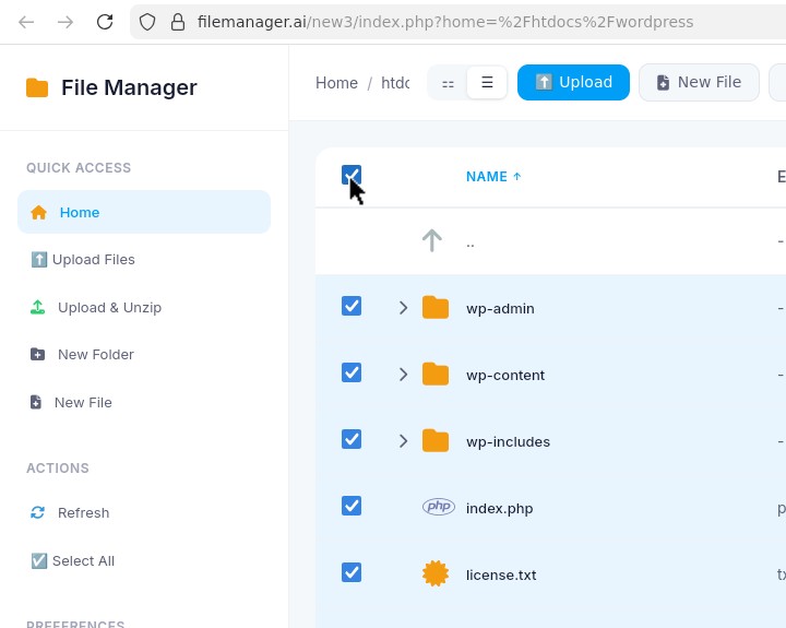 wordpressdirectory, and select every item by clicking on a checkbox at the very top. -