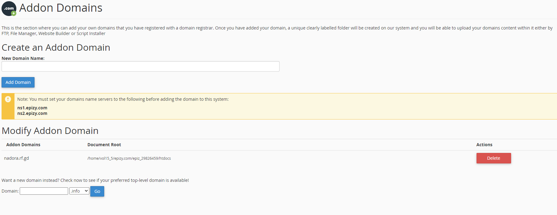 what I did is remove nadora.42web.io from my addon domains and then added it to my subdomains on the same account and it didn’t work now I cannot access nadora.42web.io