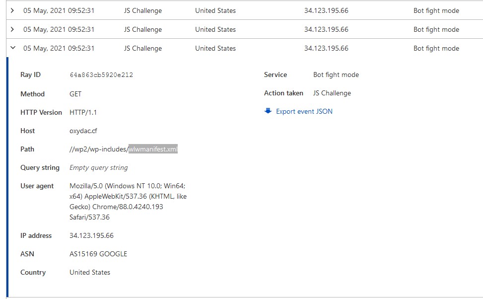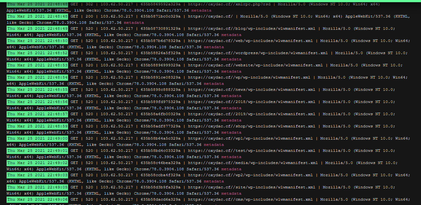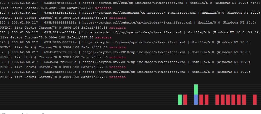 In this example, you see that the bot searches the file wlwmanifest.xml non-stop in different locations.