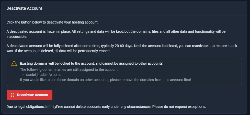 As stated on the deactivation page “Due to legal obligations, InfinityFree cannot delete accounts early under any circumstances. Please do not request exceptions.”
