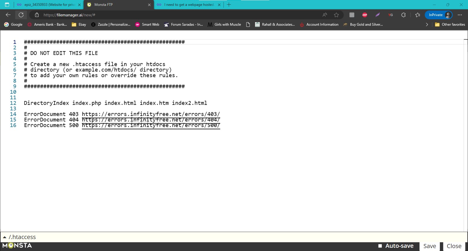 I went into File Manager to edit the .htaccess file. When I clicked on the .htaccess file and edit from the dropdown menu, I see this message: