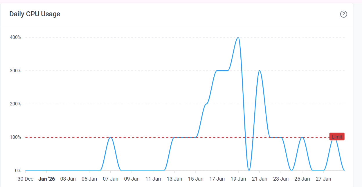 On my side, nothing changed. All I did was add the custom domain name that I pay for through GoDaddy to the website. When I first moved or added the name to the website, all was fine. It has been 1 week now, and I notice that my daily usage has changed, and I see it in this graph. Today, I tried to work on a Q&A page for the website and could only add a very small amount of text before it showed that the usage spiked, and I just stopped so that my account would not be suspended for 24 hours. Last week, the red line for my graph was at the 400% mark, or at the top of the highest spike for me. If this makes sense. The day that my CPU usage spiked was my fault. I was editing my pages and redoing the site’s images. After this, I have not been editing or even adding a page until 2 days ago, when I started to create a Q&A page, and it is not even possible for me to add a very simple page to the website anymore. I have always been mindful of the CPU usage for the site and have never had an issue until this week, when I hit the limit if I try to edit one page on the website. For several month this was not an issue, and I was able to add, edit, and modify the website daily.