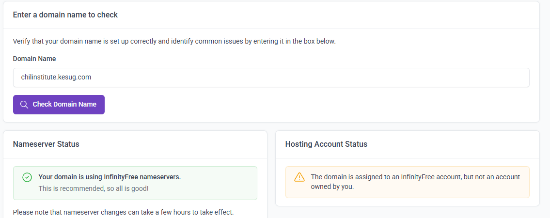 My A has not pointed to your I.P maybe weeks and I still get the message: Your InfinityFree account if0_37944606 (Website for chilinstitute.kesug.com) has been temporarily suspended.