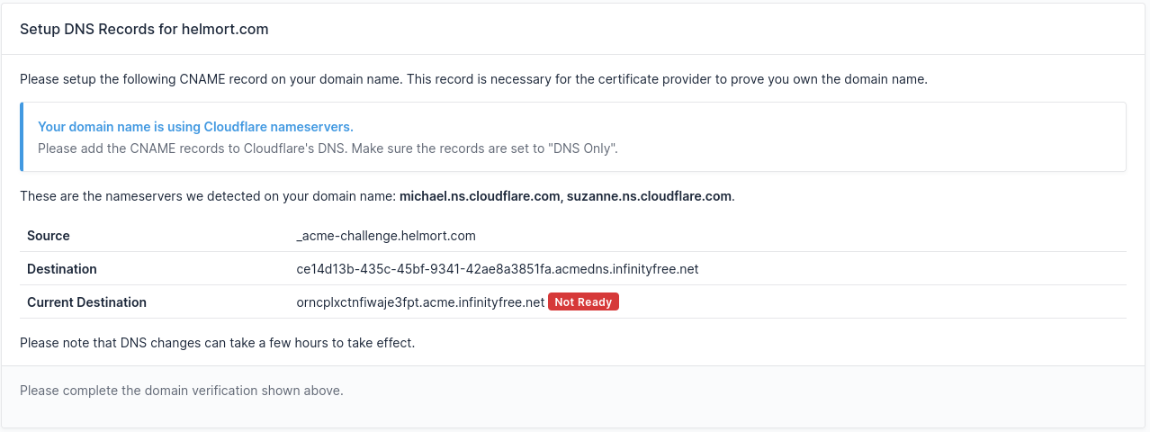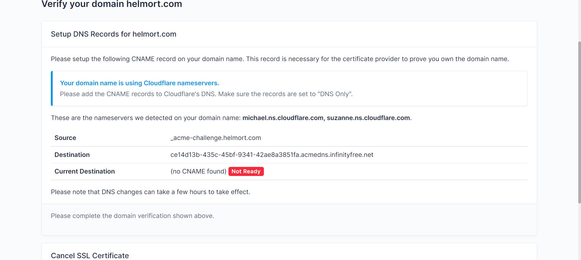 In your Cloudflare settings, you can see you’re currently using a CNAME destination that ends with acme.infinityfree.net. But in the client area, you see the correct destination is different.