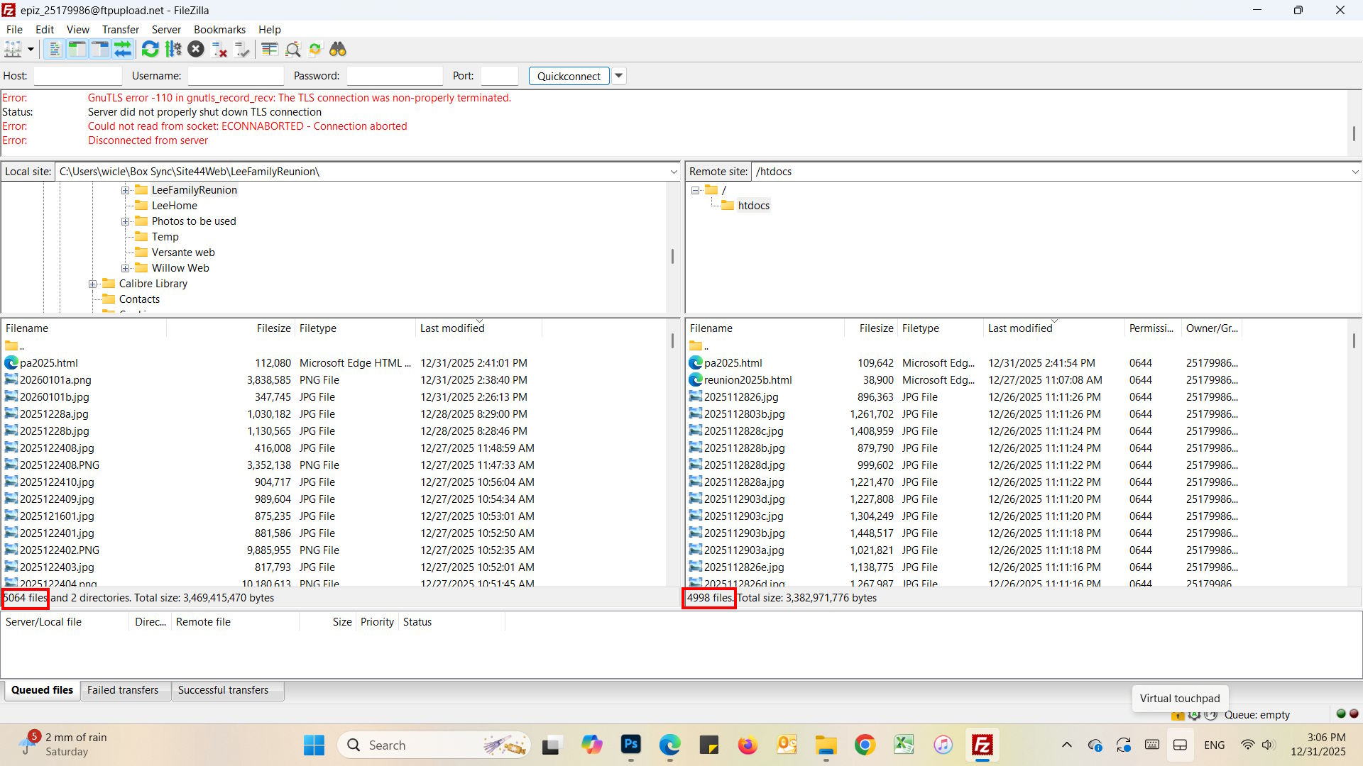 Recently I uploaded many files through Filezilla (mainly jpgs & htmls) and noticed that although files have been successfully uploaded and pictures all showed up on the website as well, yet the jpg files do not appear on the server pane of Filezilla. I also notice the Filezilla server pane file numbers always remain at 4998 although all files in my own directory shows 5064. From the picture uploaded here, jpg files are missing between 27-31Dec2025.