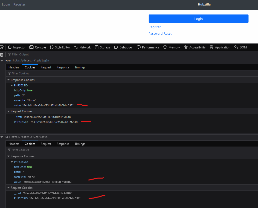that the session cookies that are requested and that are returned do not match when the login button is pressed