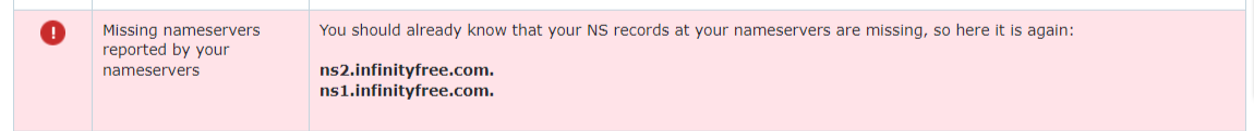 this the custom Cname record in Infinity free C panel. when type the above “sender…” it goes to the one of service provider site. it was work more than a year well. now it is not working. That service provider said issue is What is mentioned earlier. {Missing nameservers reported by your nameservers. You should already know that your NS records at your nameservers are missing, …] he shows it to me using intodnscom . still the things not working…