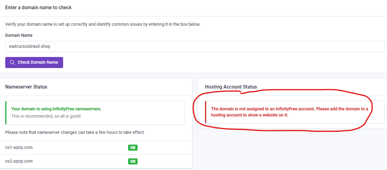 I have a hostinger domain and the nameservers are already configured with “ns1.epizy.com and ns2…” it’s been more than 72 hours and when I check the dnschecker website my domain has not yet been propagated in any… all with the Red X… what to do in this case?
