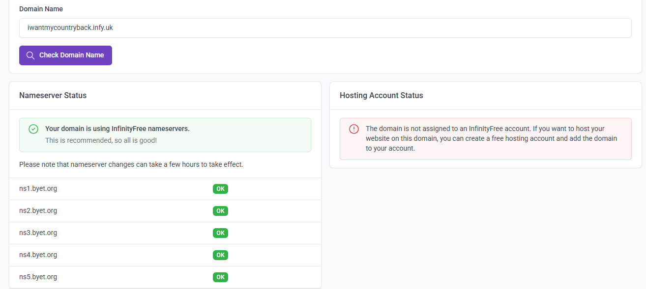 My (only a few pages [3 in fact] voicing(blogesque) simple) website used to work fine but now it doesn’t, can you tell me what has happened please? as I haven’t changed anything. It doesn’t display when I type the web address but did before. The website address is " iwantmycountryback.infy.uk "
