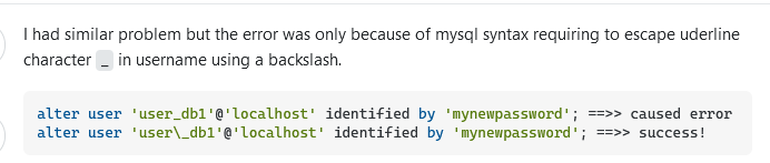 18:37:54 ALTER USER ârootâ IDENTIFIED WITH mysql_native_password BY â(mypasswordhere)â Error Code: 1396. Operation ALTER USER failed for ârootâ@â%â 0.125 sec