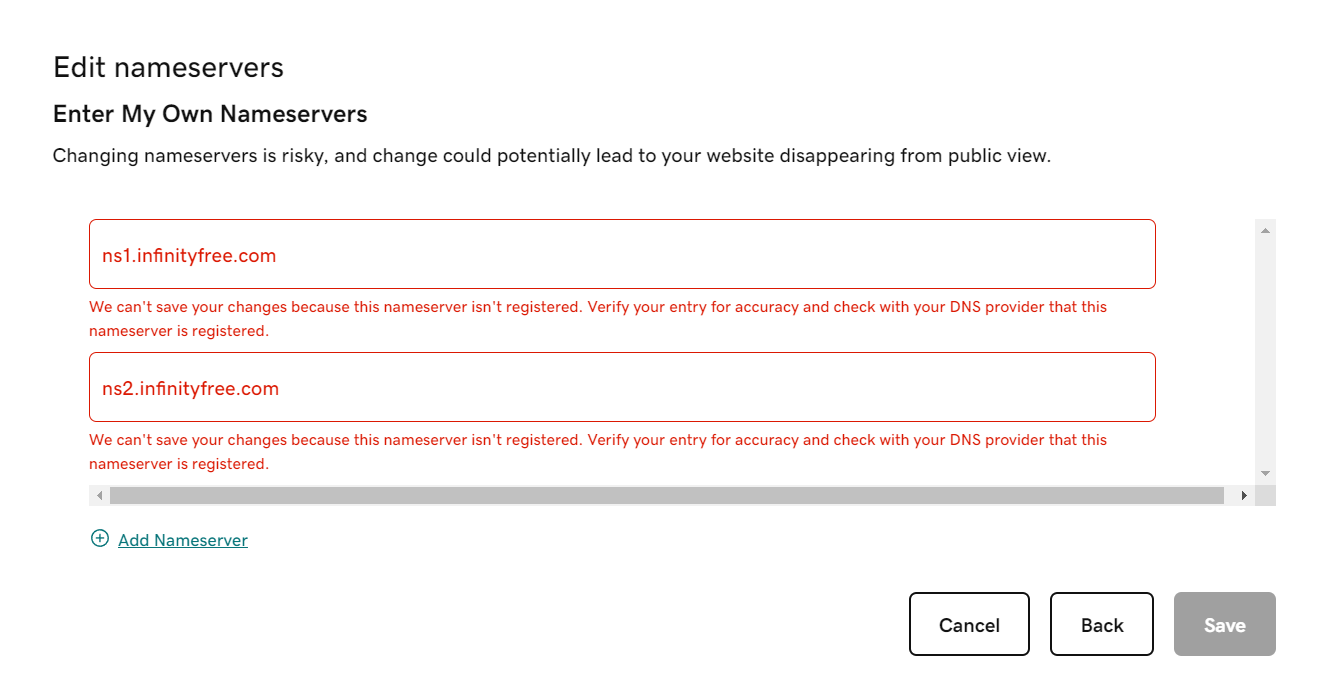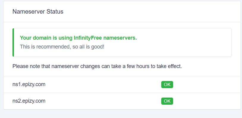 are ns1.epizy and ns1. infinityfree different. As Name cheapsupport is saying ns1.infinityfree is not registered thats why it showing error to add these in namecheap. but I have successfully added. epizy one. thanks for help