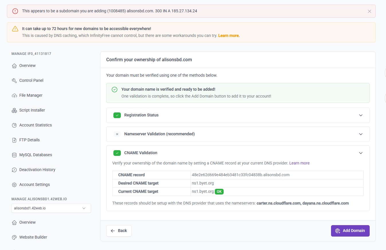 My domain alisonsbd.com is currently showing as a subdomain (1008485) internally.
